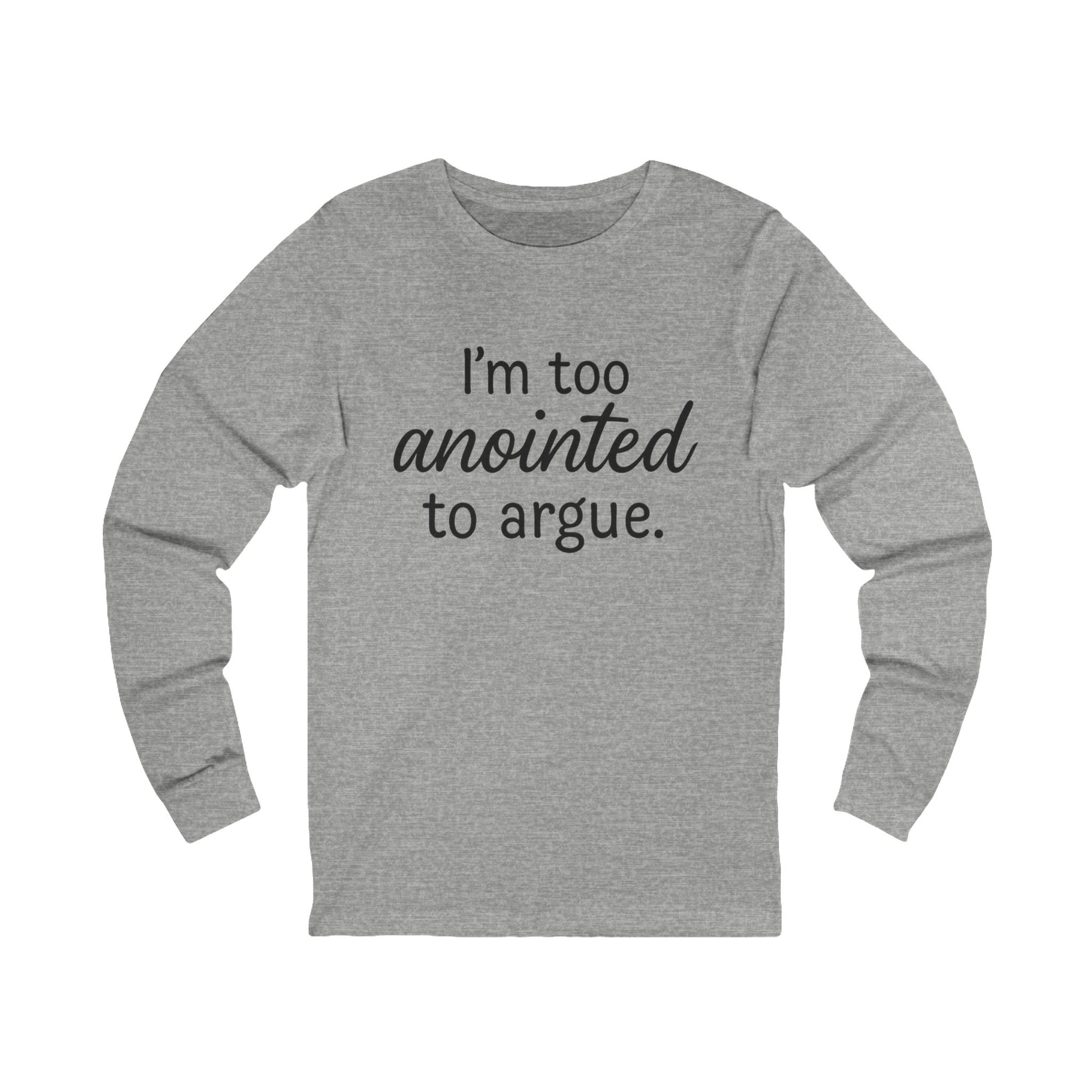 “I’m Too Anointed To Argue” Long Sleeve Tee – Black Lettering | Faith-Inspired Christian Shirt for Believers & Bold Women of God