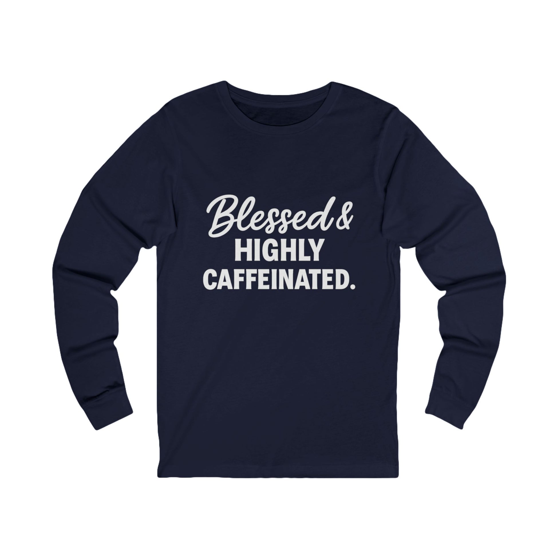 Blessed & Highly Caffeinated Long Sleeve Tee – Funny Christian Coffee Shirt in White Lettering