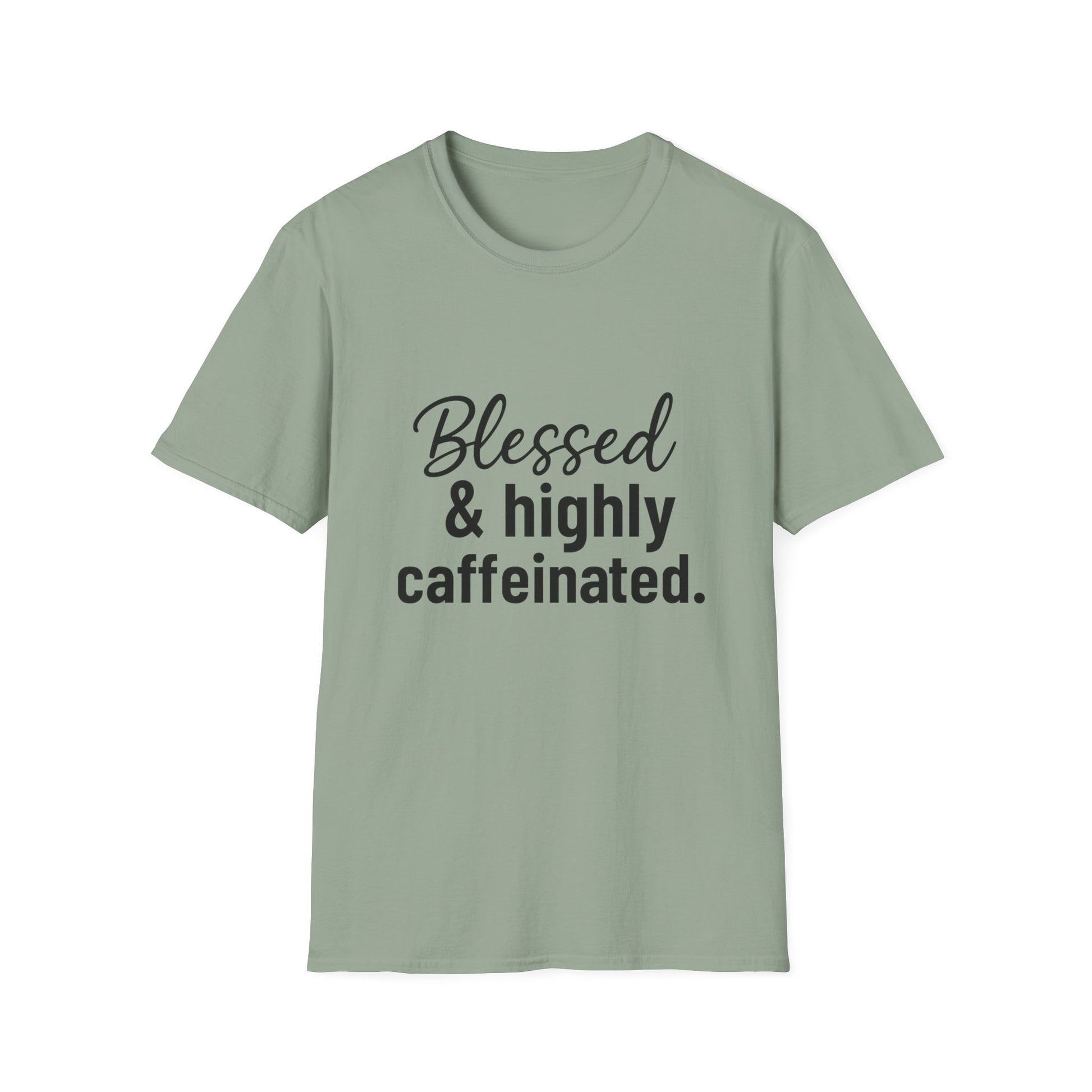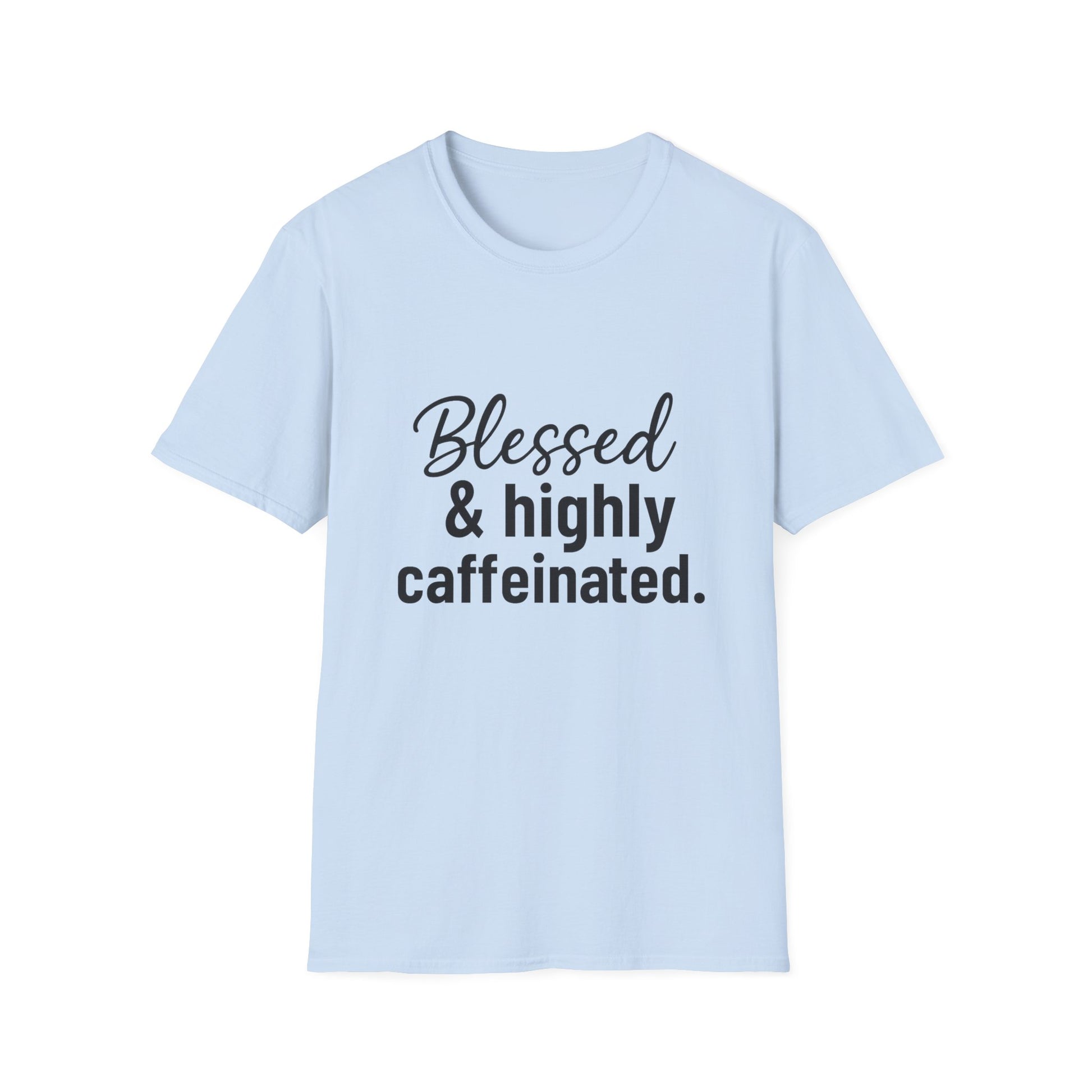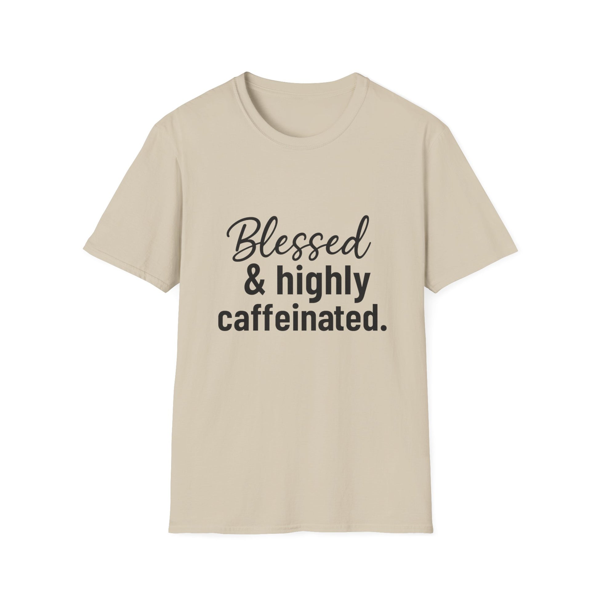 Blessed & Highly Caffeinated T-Shirt – Funny Christian Coffee Lover Tee with Black Lettering