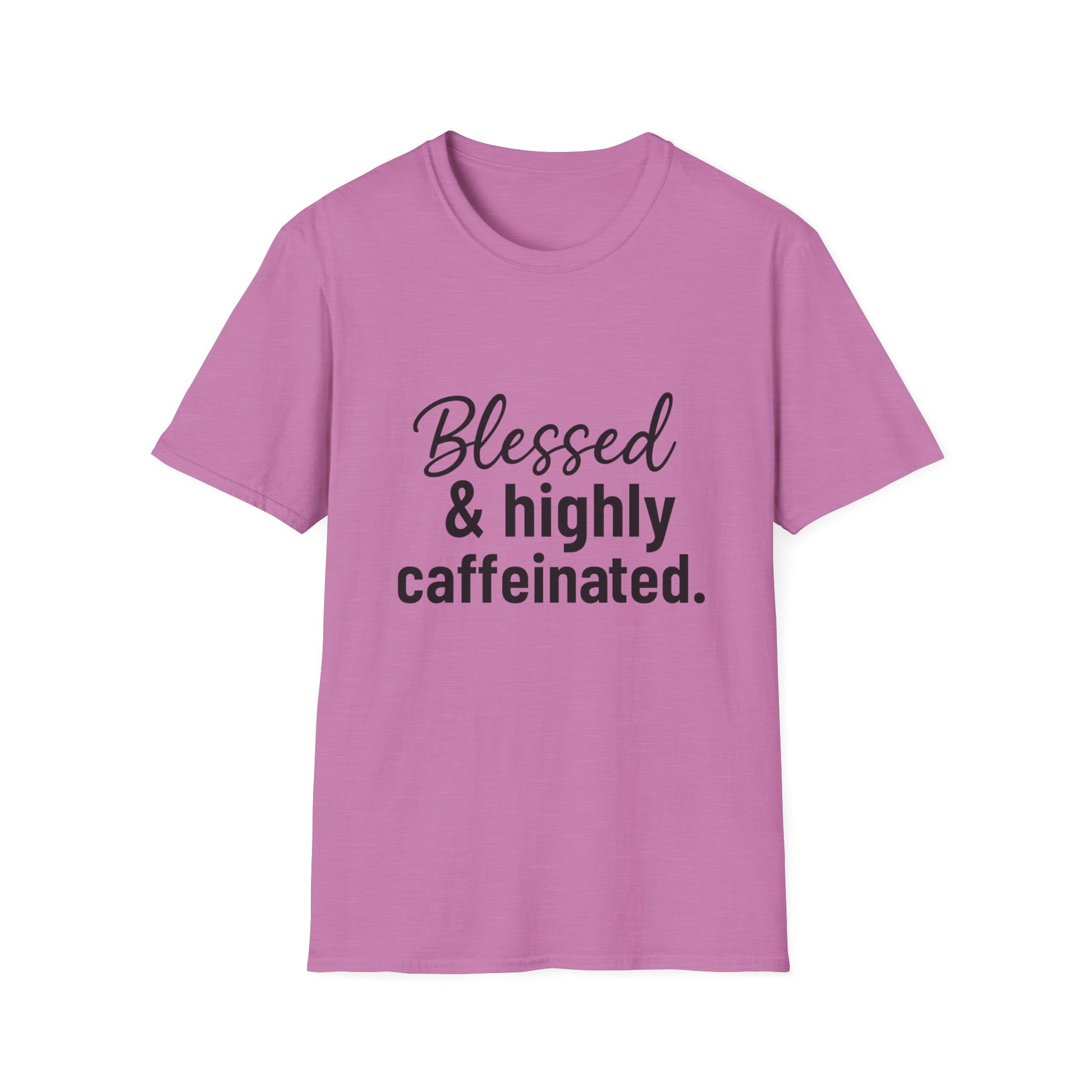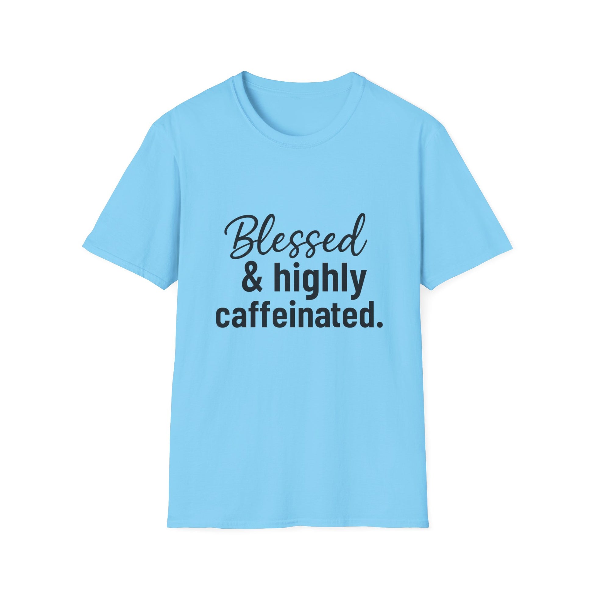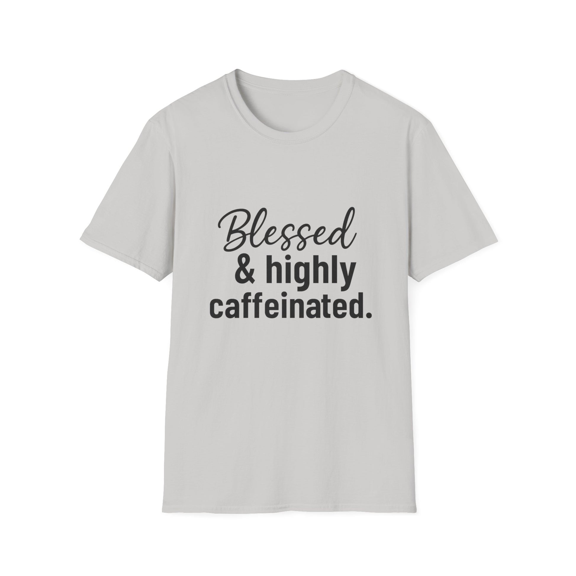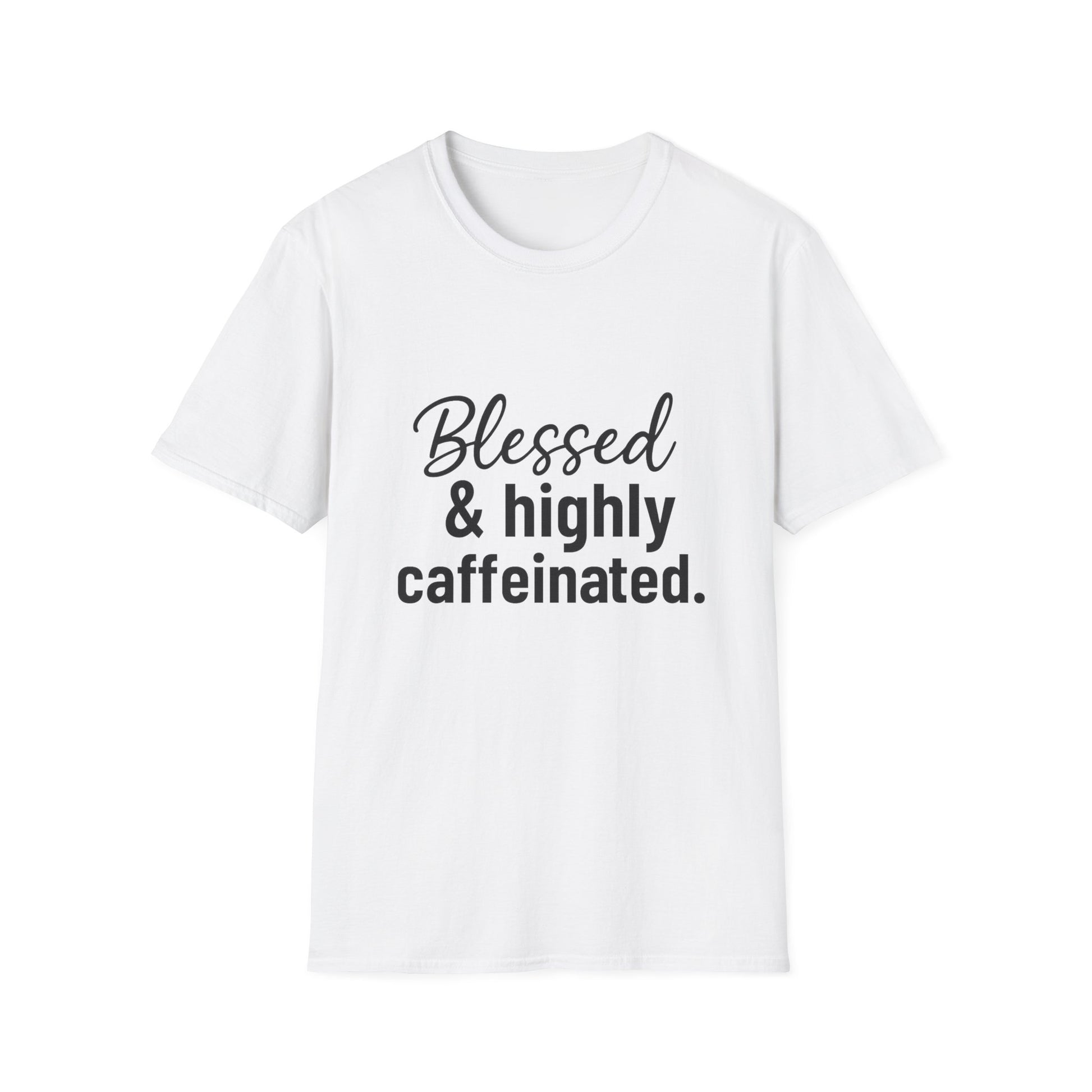 Blessed & Highly Caffeinated T-Shirt – Funny Christian Coffee Lover Tee with Black Lettering