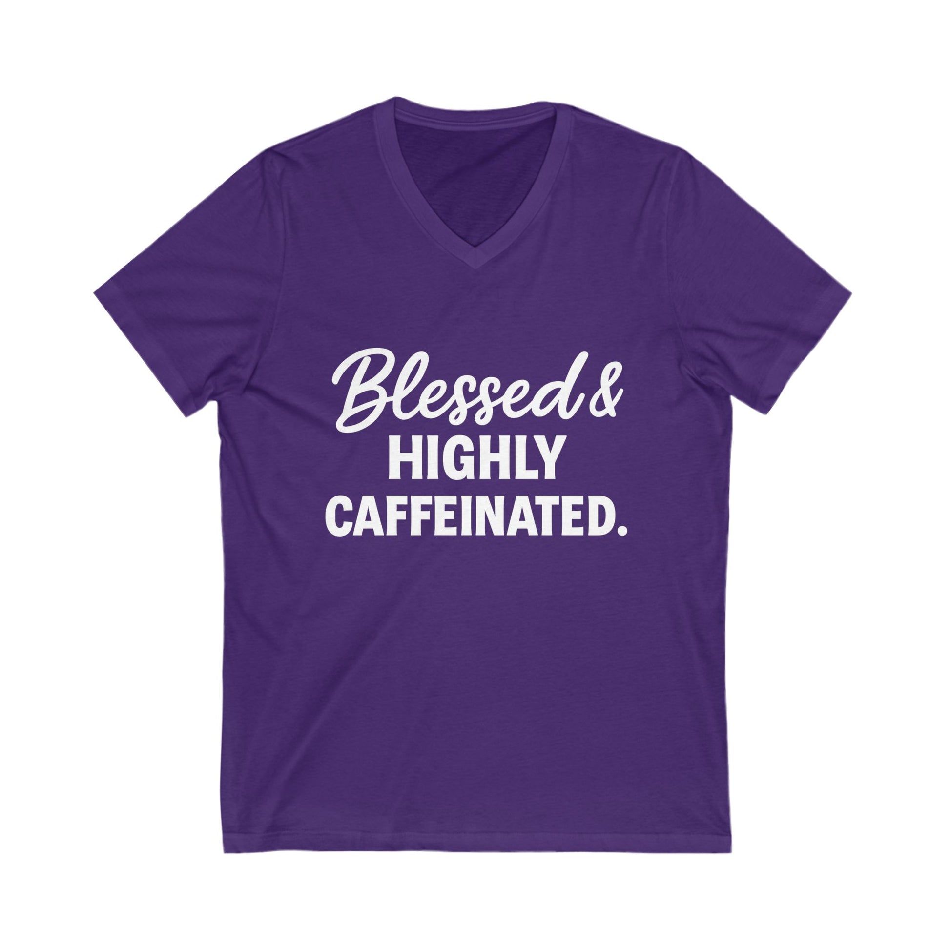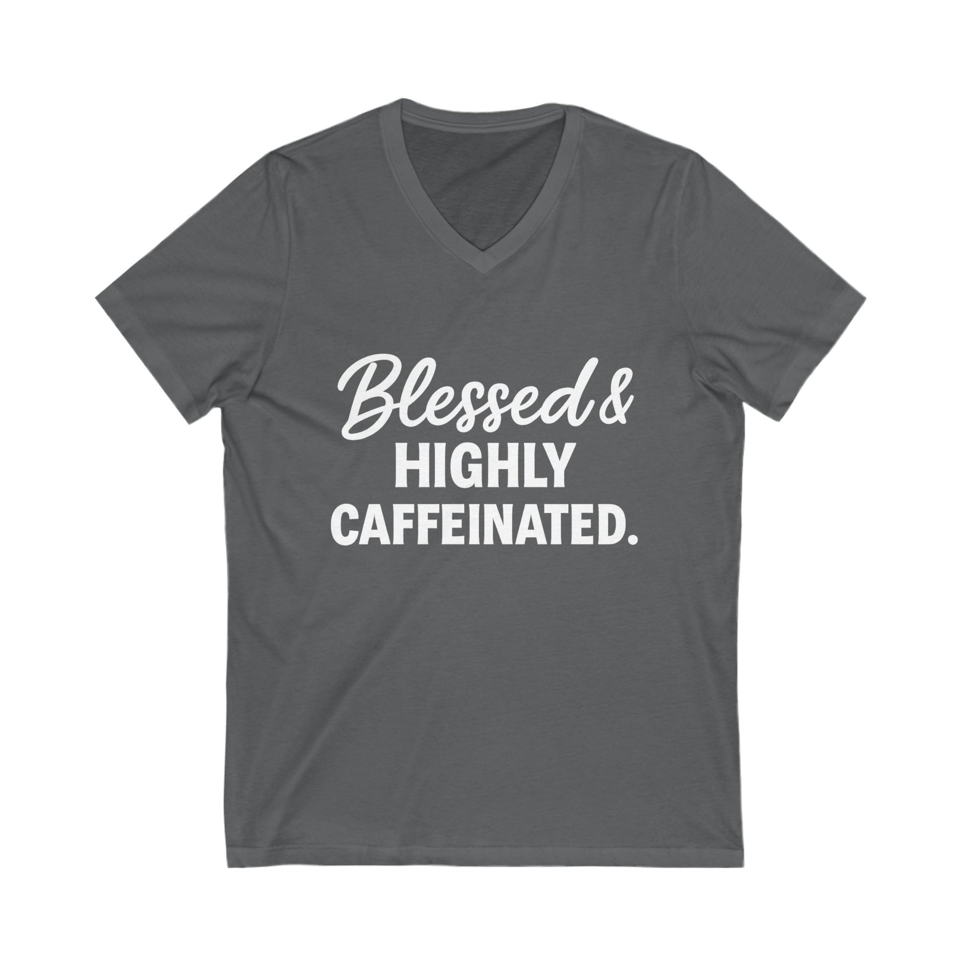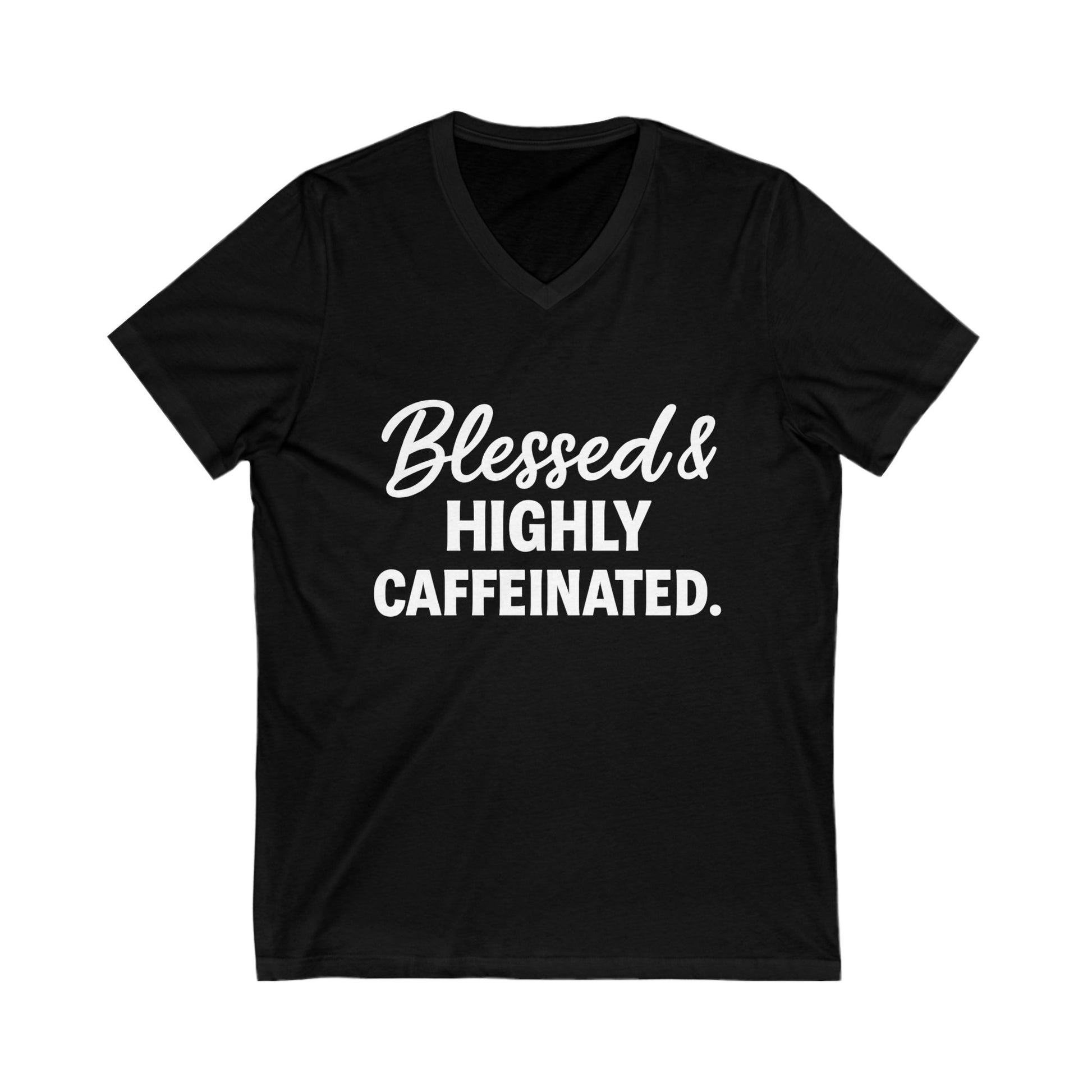 Blessed & Highly Caffeinated V-Neck Tee – Funny Faith-Based Coffee Shirt (White Lettering)
