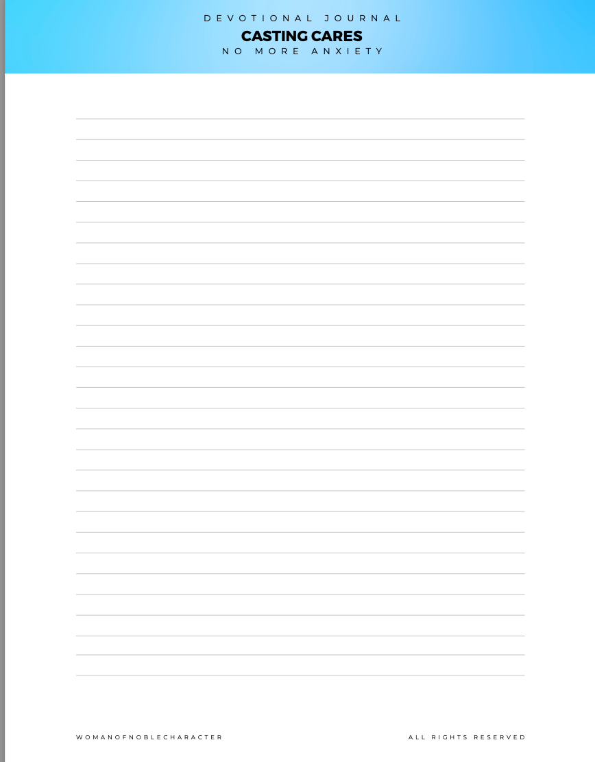 Find lasting peace in the promises of God with the Casting Cares: No More Anxiety Devotional & Journal. Designed specifically for Christian women struggling with anxiety, stress, and worry, this beautifully guided 30-day devotional and journal helps you cast your cares on the Lord and receive His perfect peace.