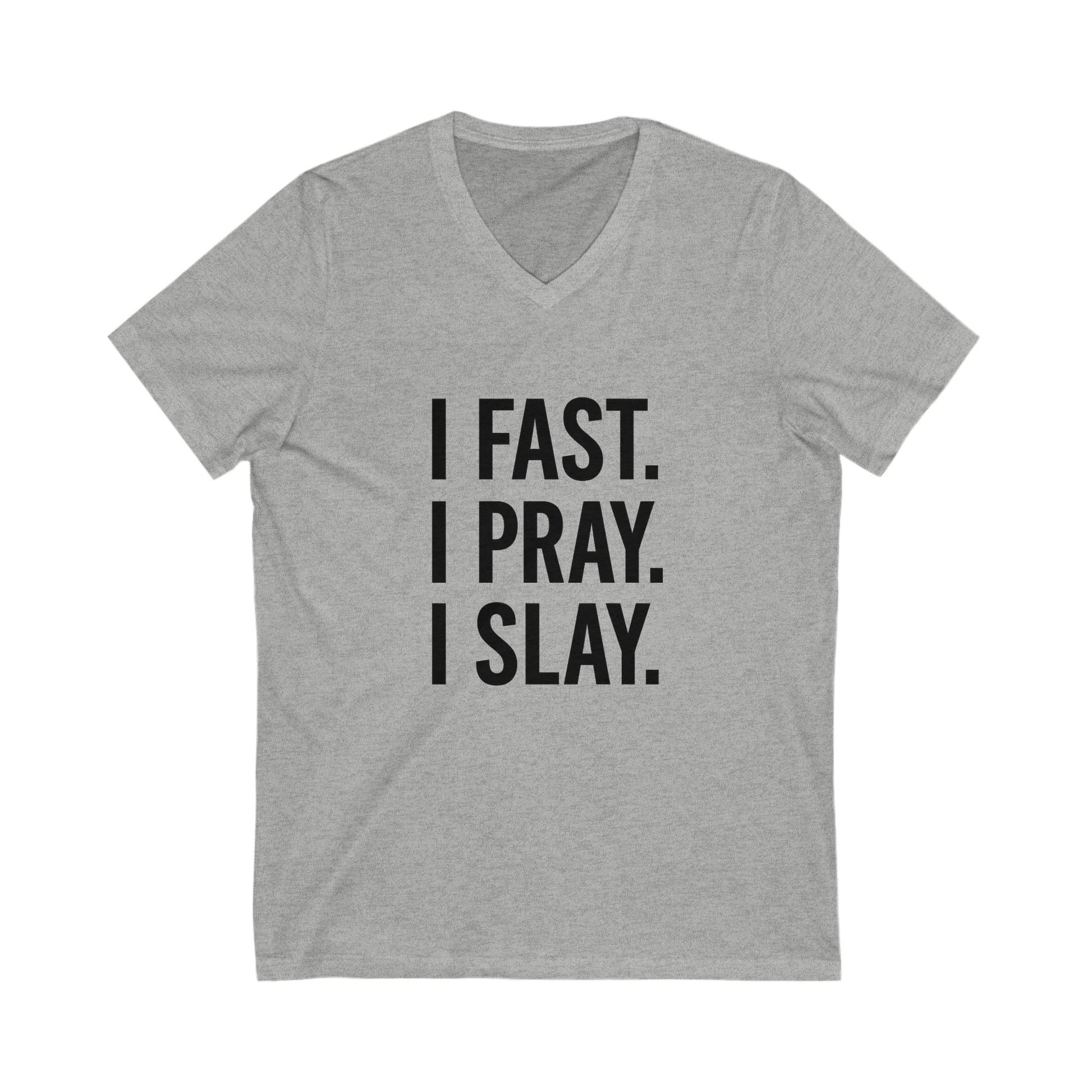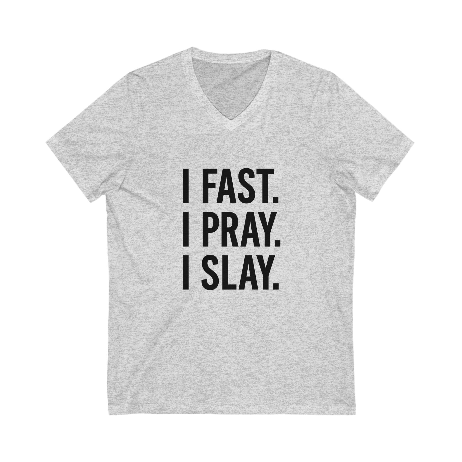 "I Fast. I Pray. I Slay." Unisex Round Neck T-Shirt – Black Lettering Christian Tee for Spiritual Warriors
