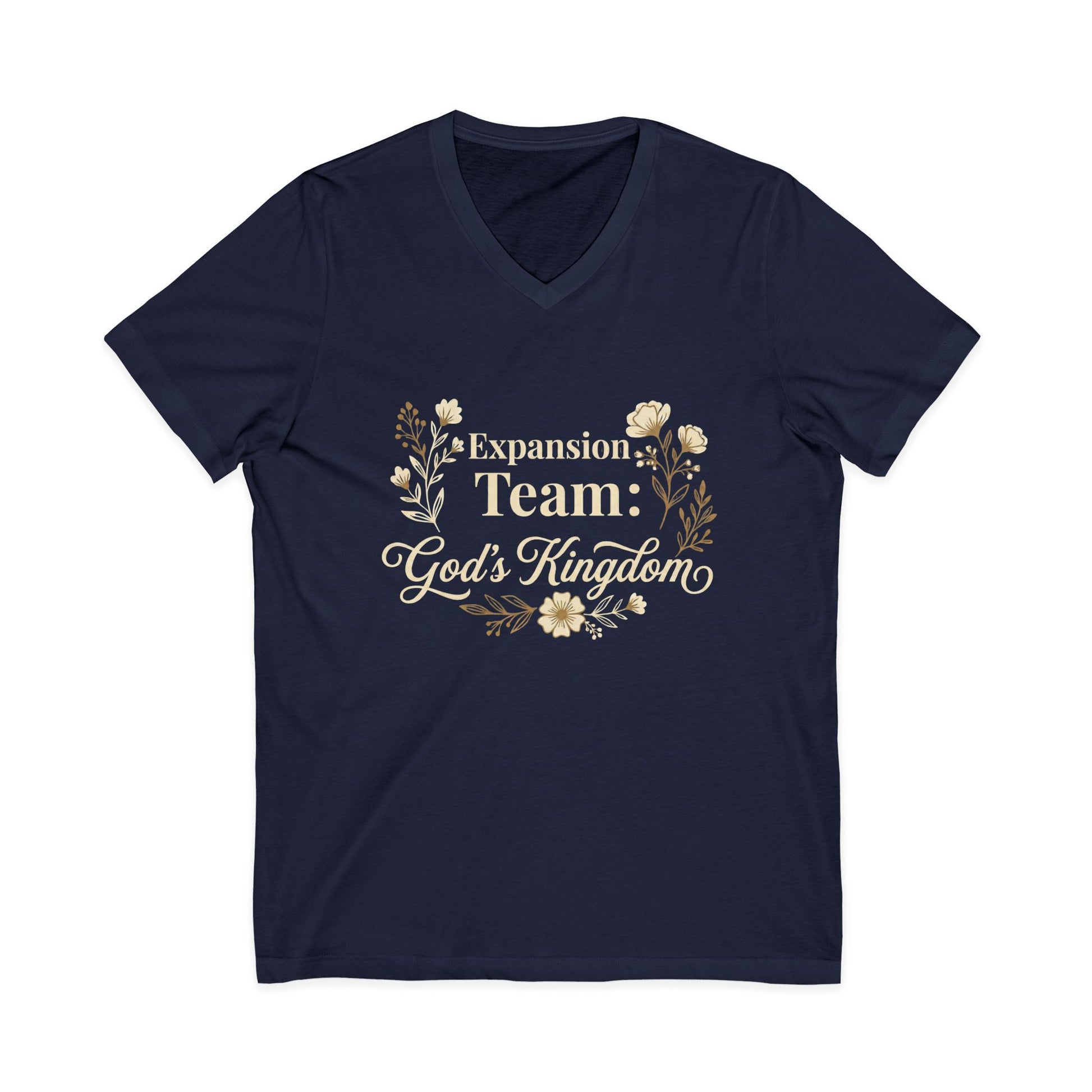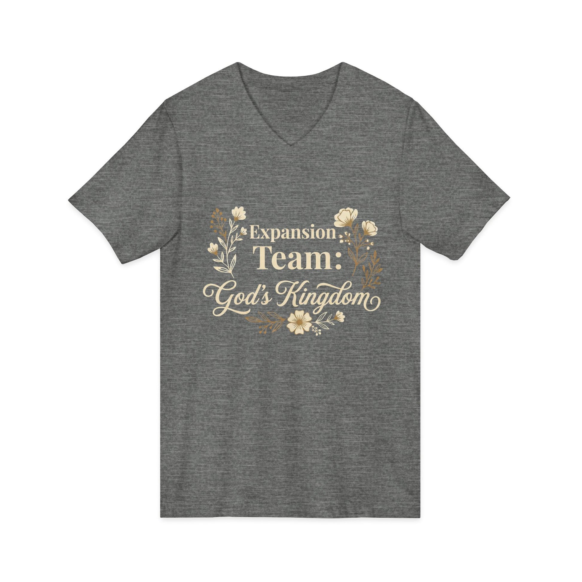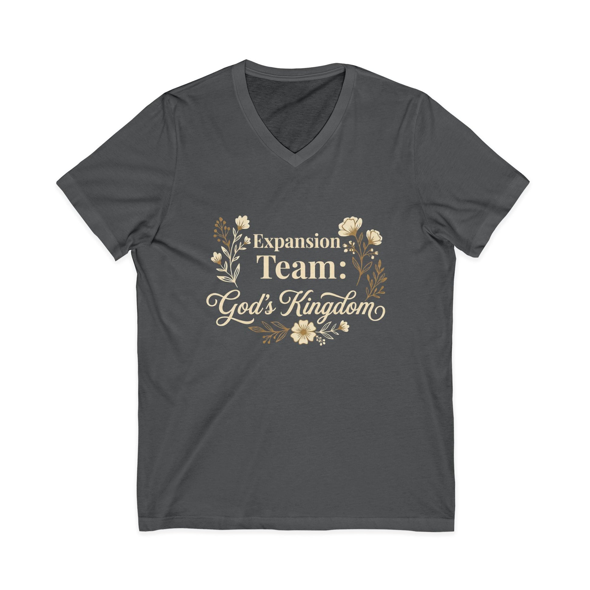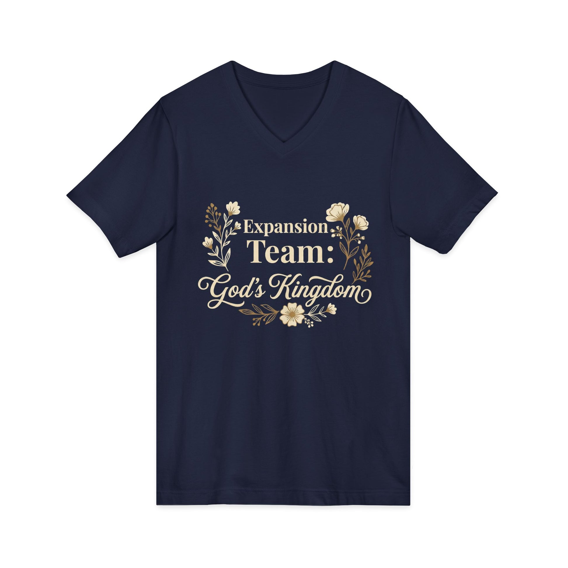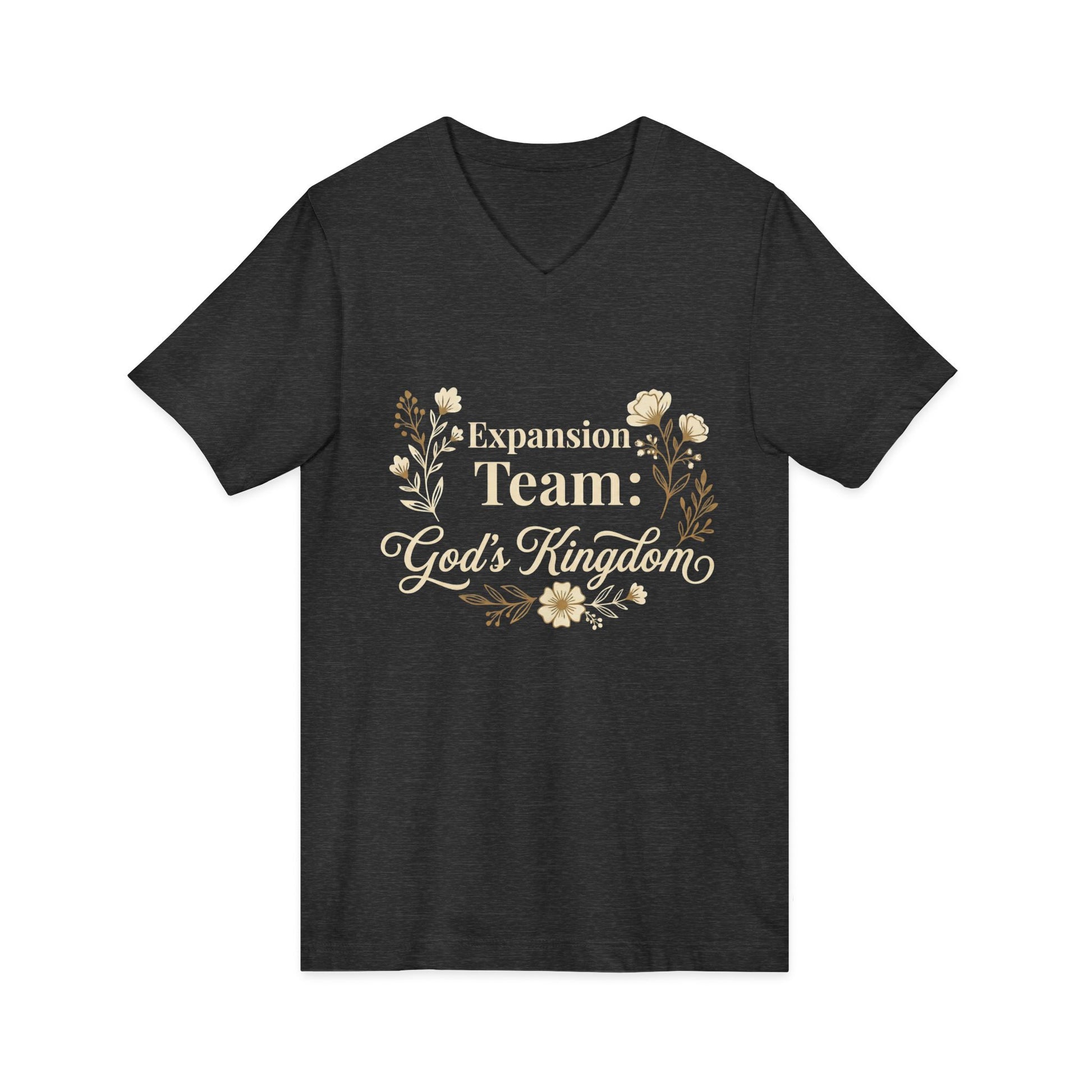 Wear this V-neck as a quiet announcement of belonging and purpose. The soft, lightweight cotton drapes easily over the shoulders, letting the words Expansion Team: God's Kingdom take center stage without shouting. It sits naturally in everyday rhythms — Sunday gatherings, volunteer days, coffee runs with fellow believers, or late-night prayers — and carries with it a calm conviction. The V-neckline and retail fit give a contemporary silhouette that layers well under cardigans or over a simple camisole. Thoughtfully made and responsibly manufactured, it feels intentional from the first touch to the last wear. Let it be the tee you reach for when you want your faith to be seen with humility and clarity.