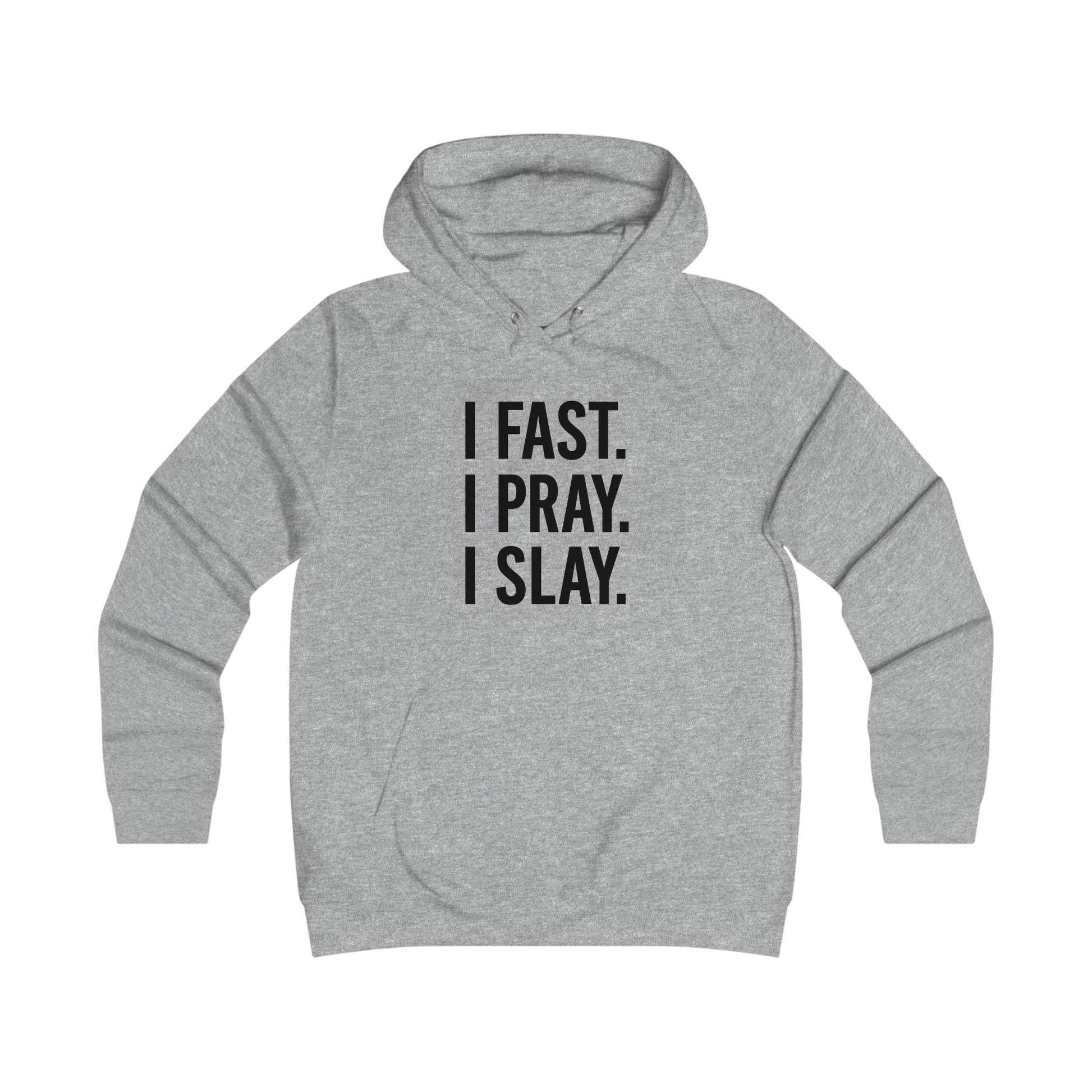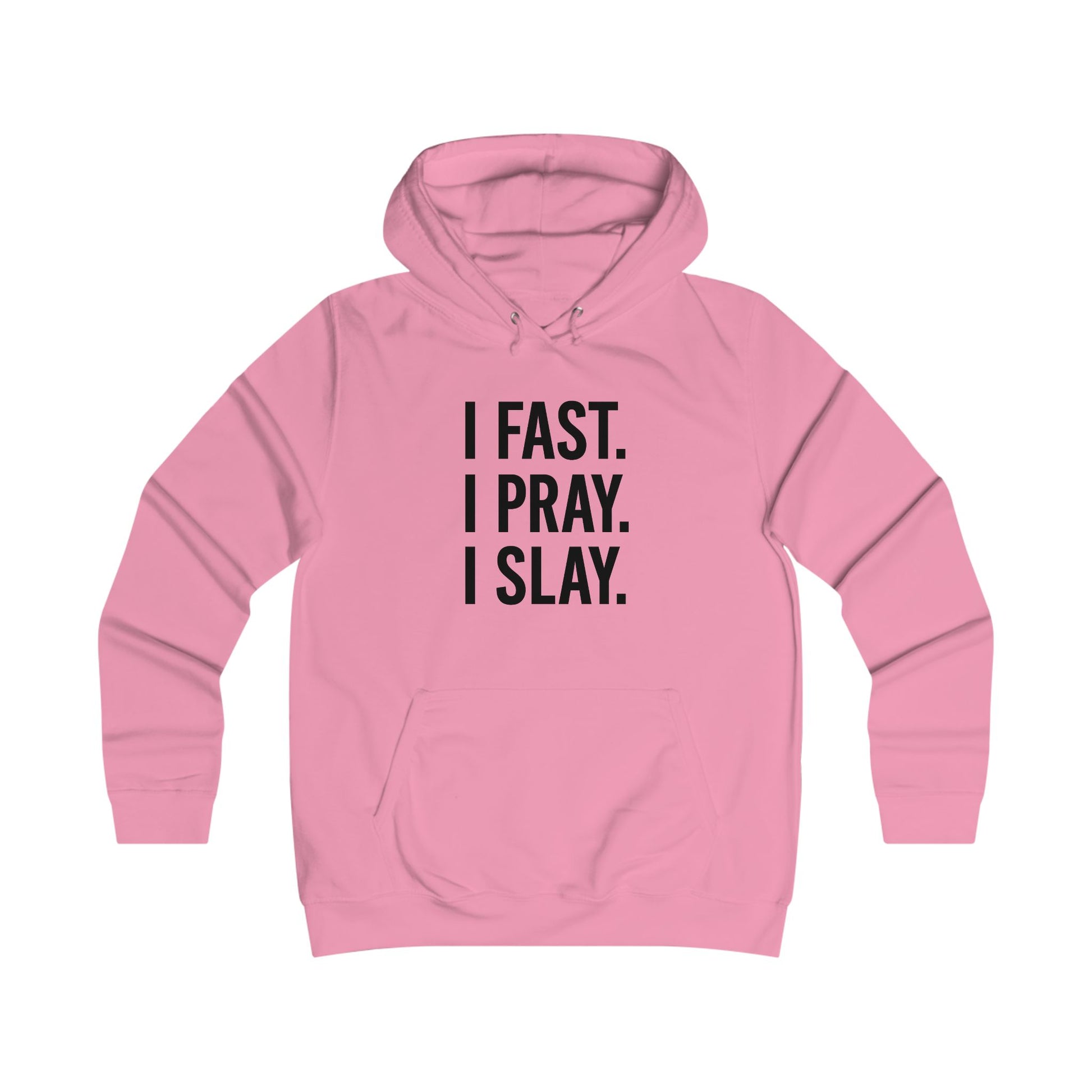 I Fast Pray Slay Girlie College Hoodie - Motivational Gift, College Apparel, Casual Wear, Inspirational Sweatshirt, Perfect for Students