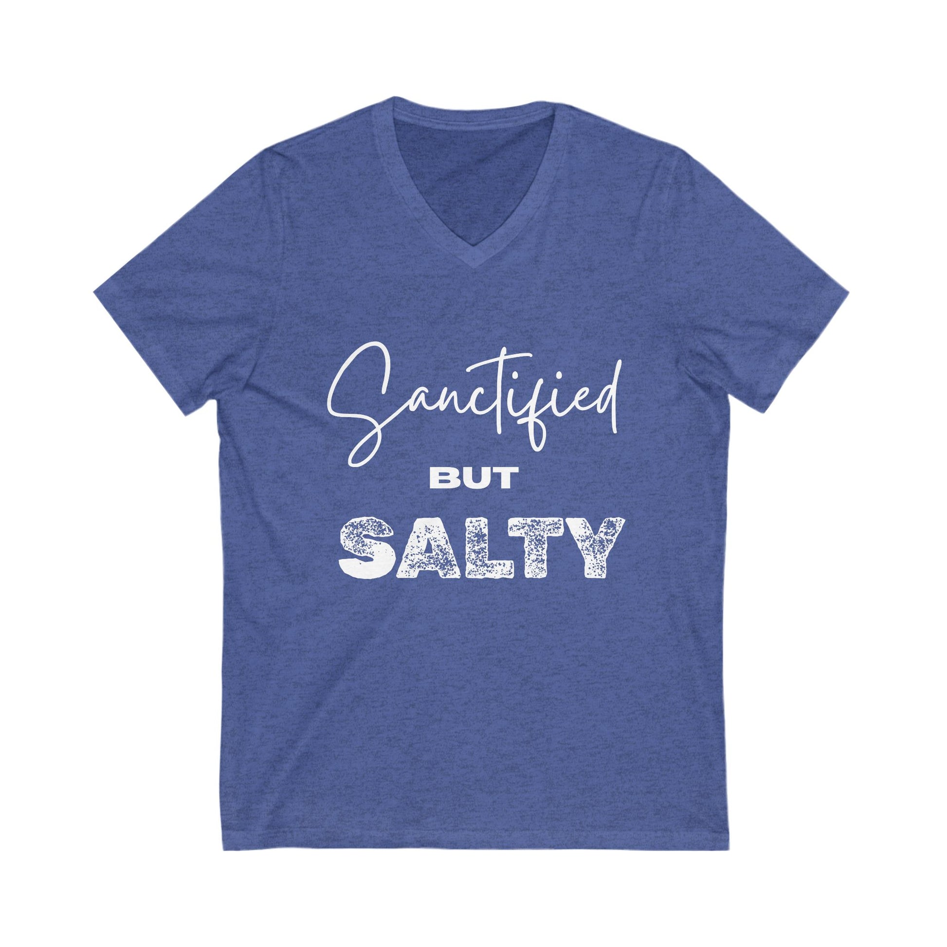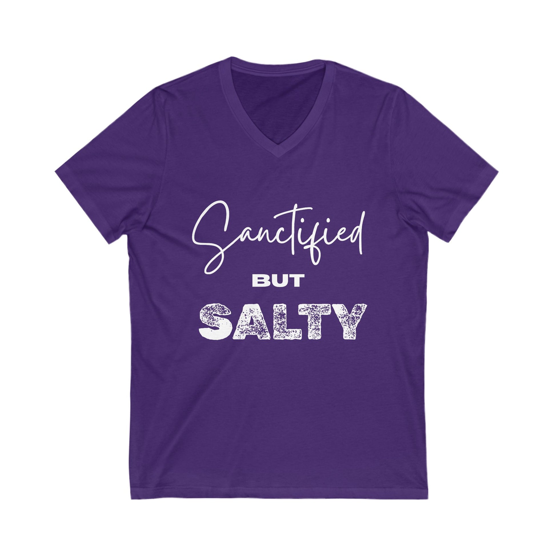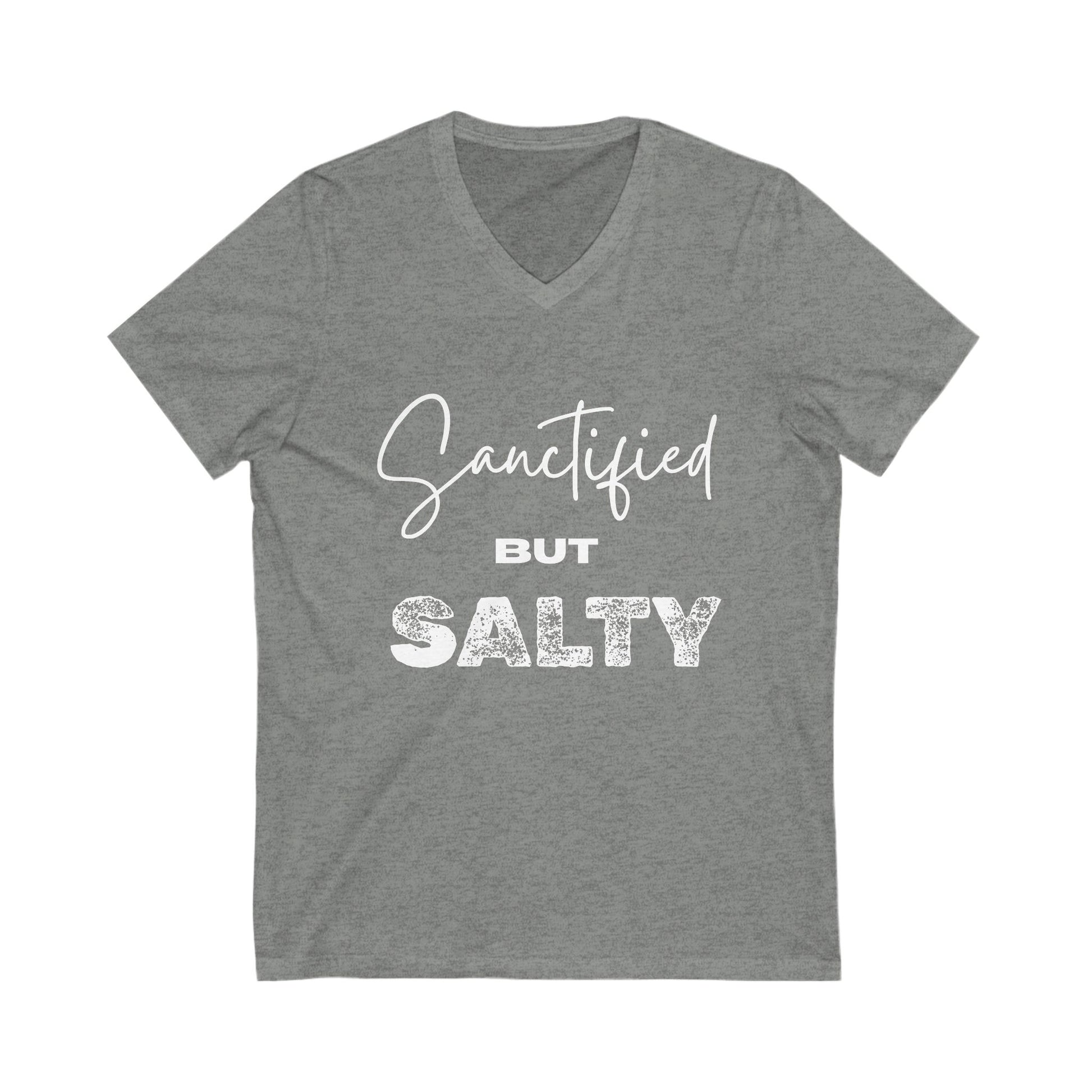 "Sanctified But Salty" Unisex V-Neck Tee – Funny Faith-Inspired Shirt in White Lettering