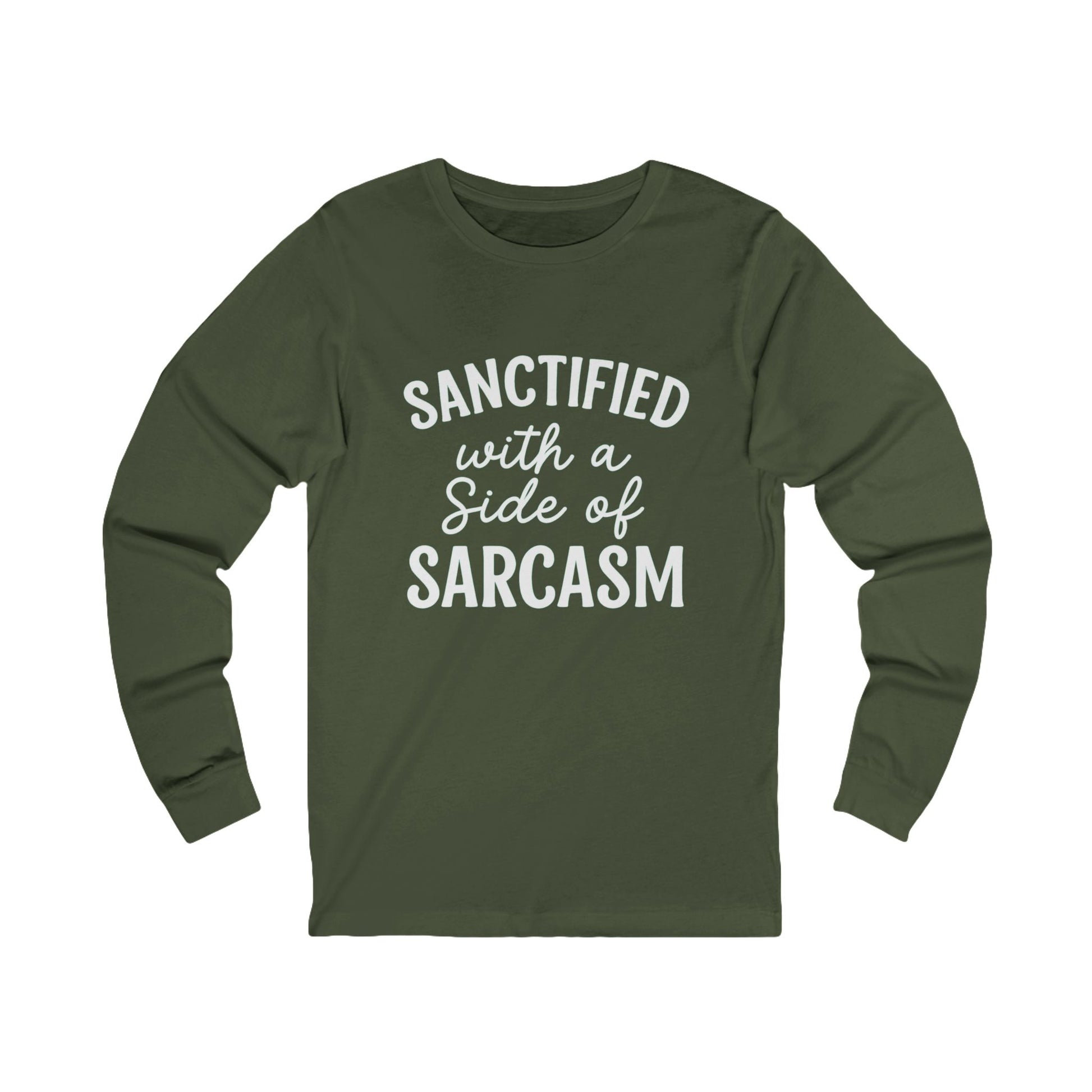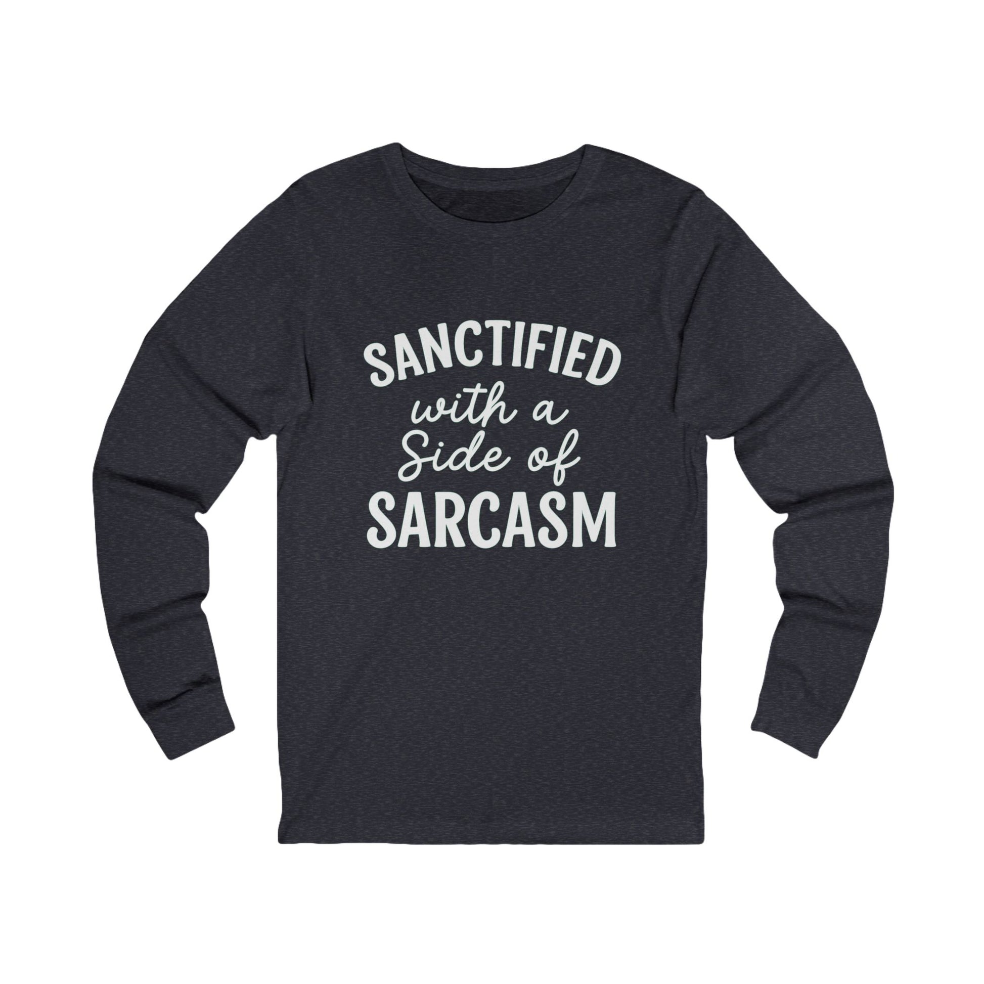 Sanctified with a Side of Sarcasm Long Sleeve Tee – White Lettering | Funny Christian Shirt for Faith-Filled Sass