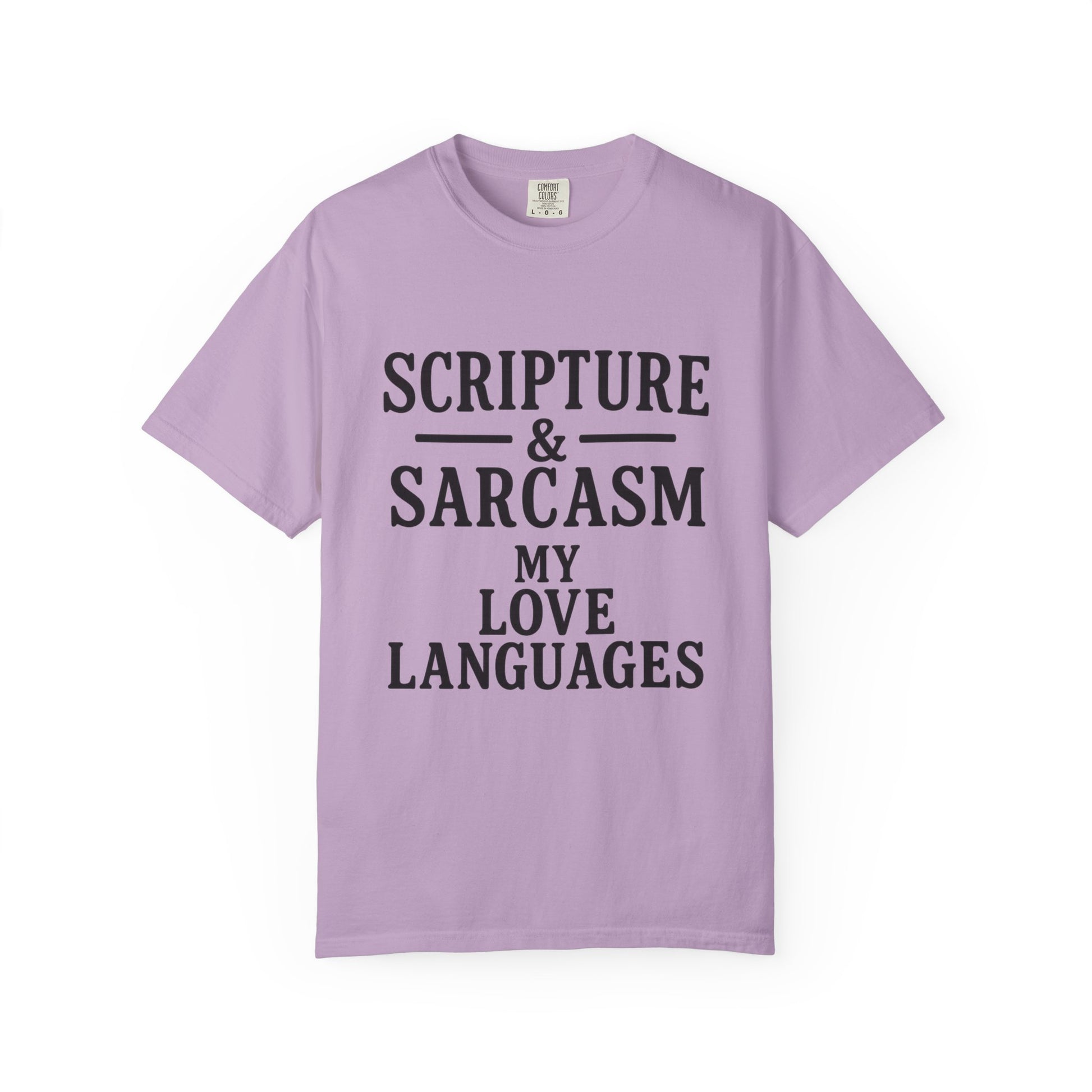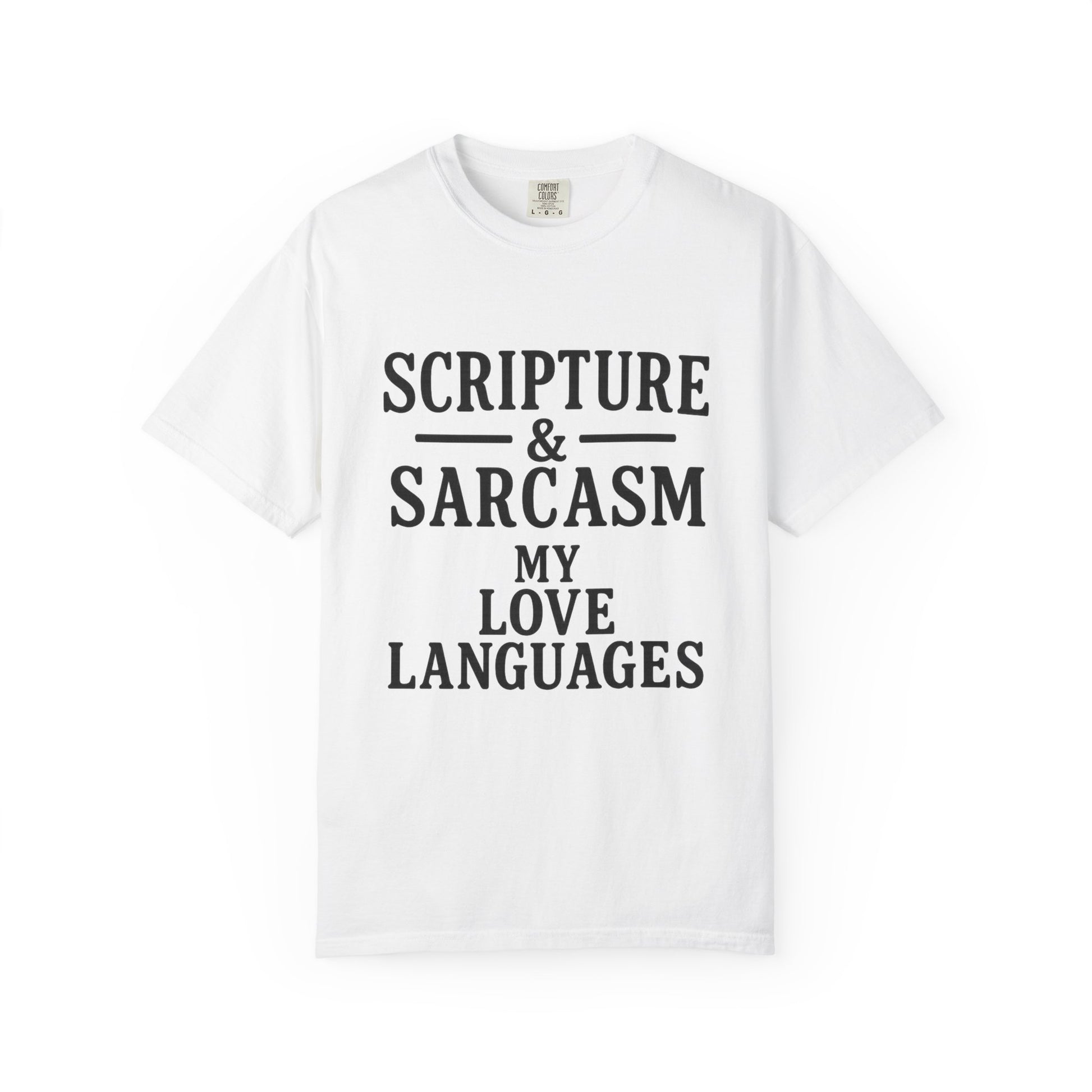 Let’s get real: your love languages aren’t hand-holding or compliments—they’re Bible verses and side-eye. This “Scripture & Sarcasm. My love languages.” tee lets everyone know your communication game is spiritual and snarky.