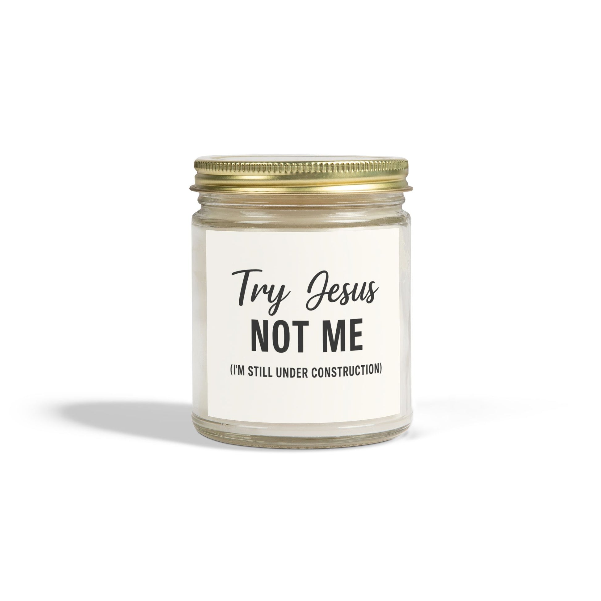 Try Jesus, Not Me. I’m Still Under Construction – 4oz Scented Candle, Coconut Apricot Wax, Funny Christian Gift, Faith with a Side of Realness