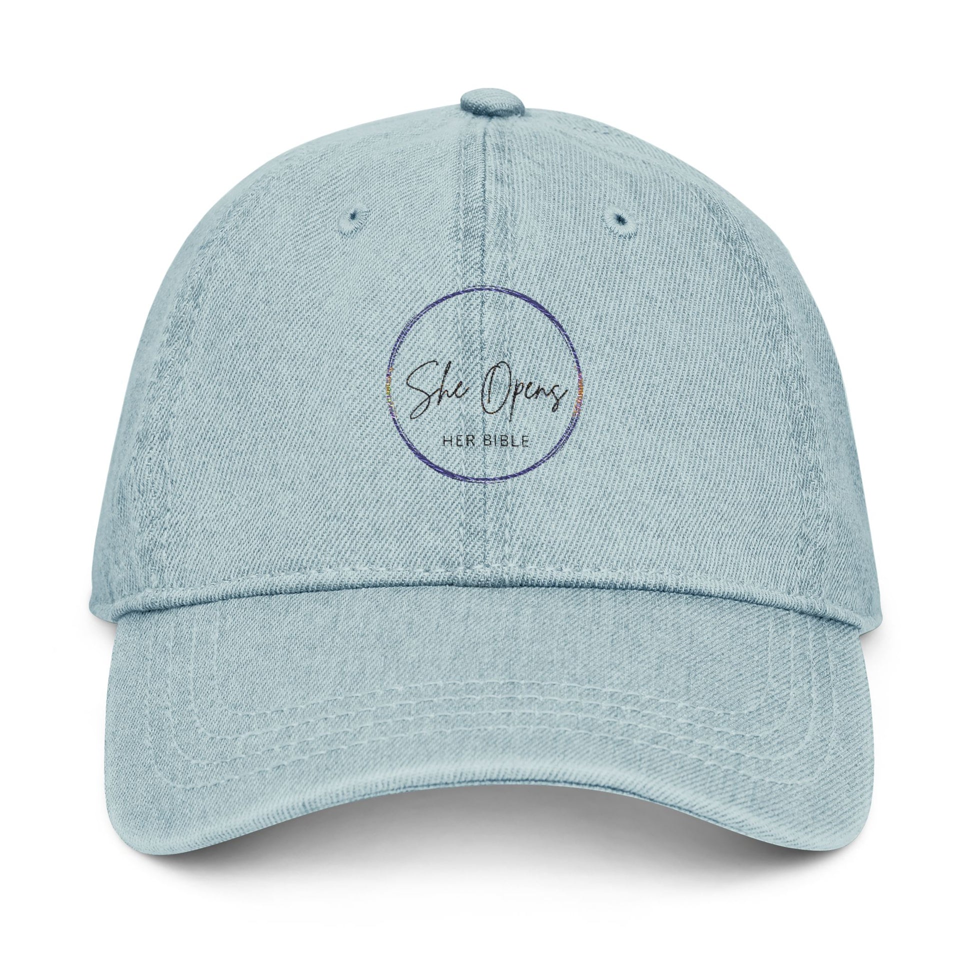 She Opens Her Bible™ Vintage Denim Baseball Hat – Embroidered Christian Cap with Adjustable Strap