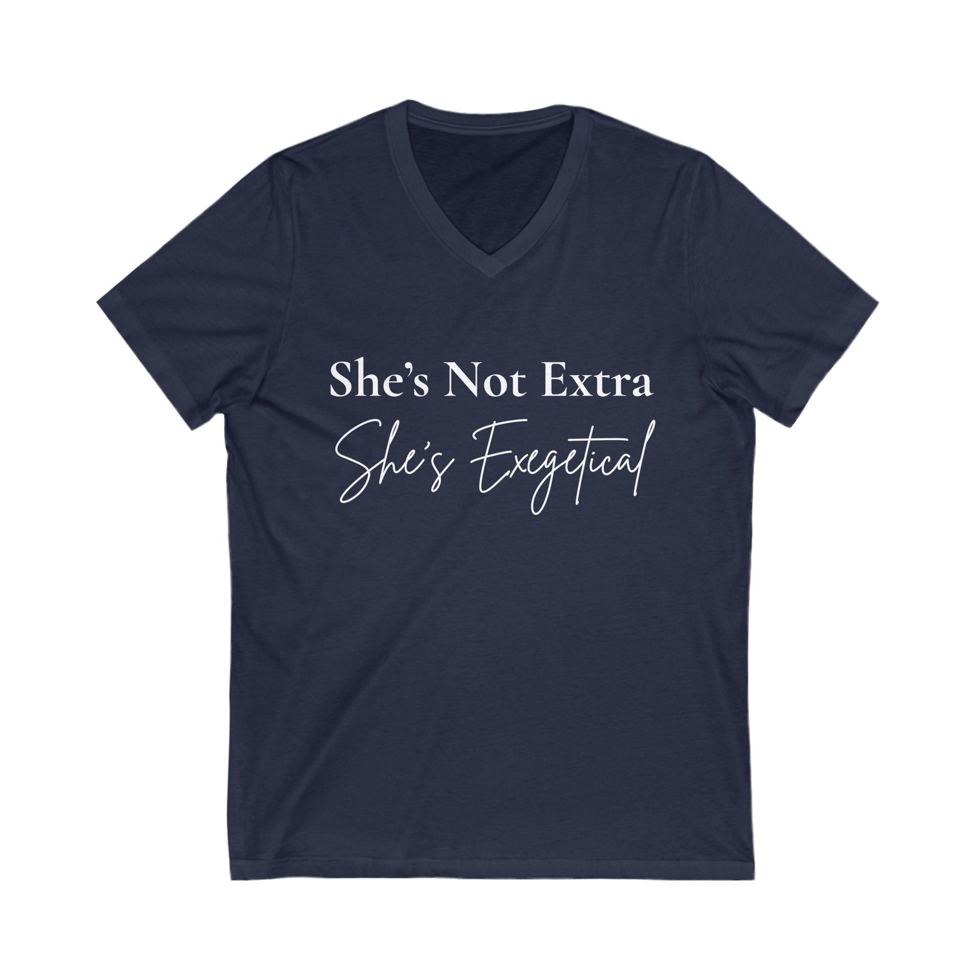 “She’s Not Extra. She’s Exegetical.” Hoodie – White Lettering Faith v-neck T-shirt for Bold, Bible-Loving Women