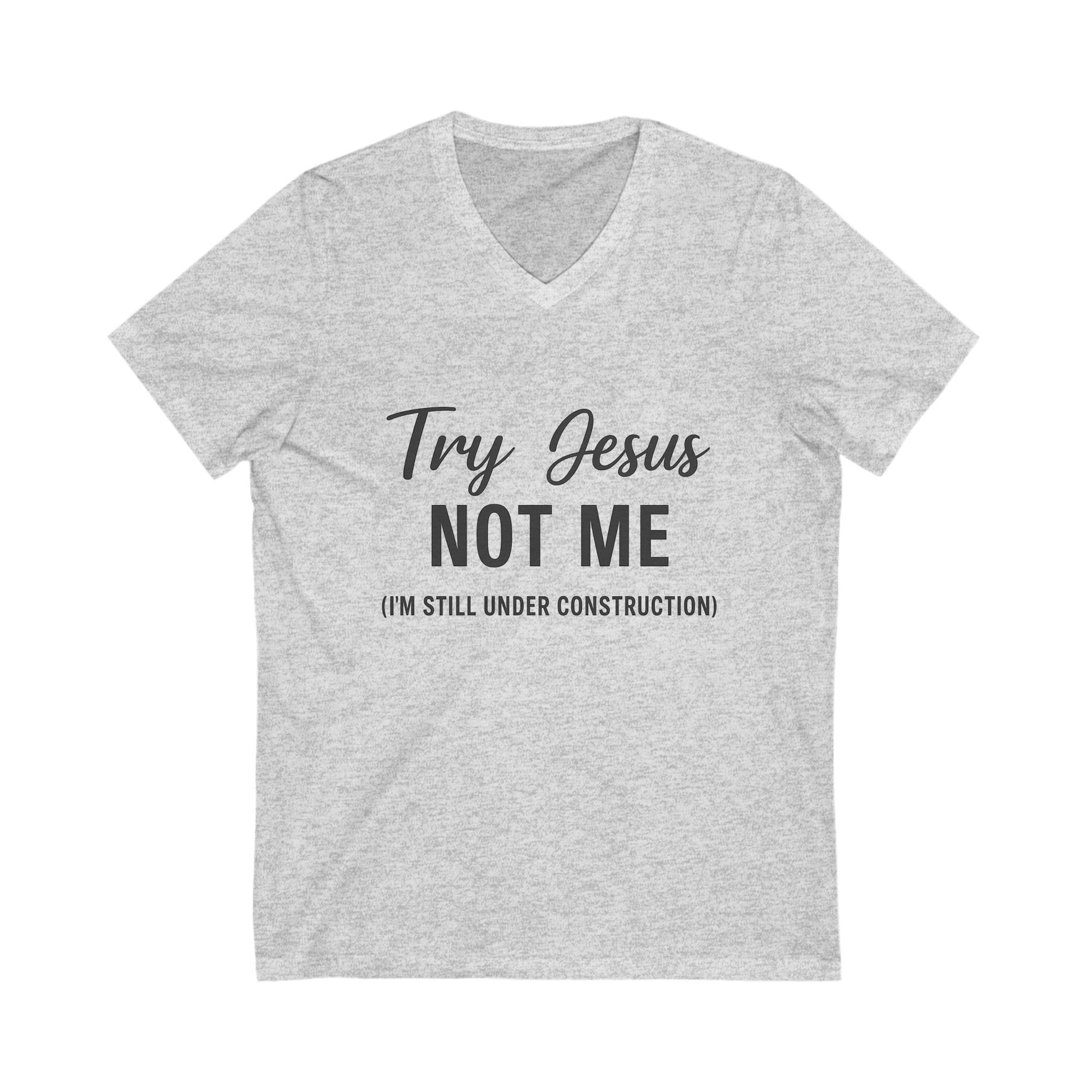 "Try Jesus, Not Me" V-Neck T-Shirt – Unisex Christian Humor Tee in Black Lettering